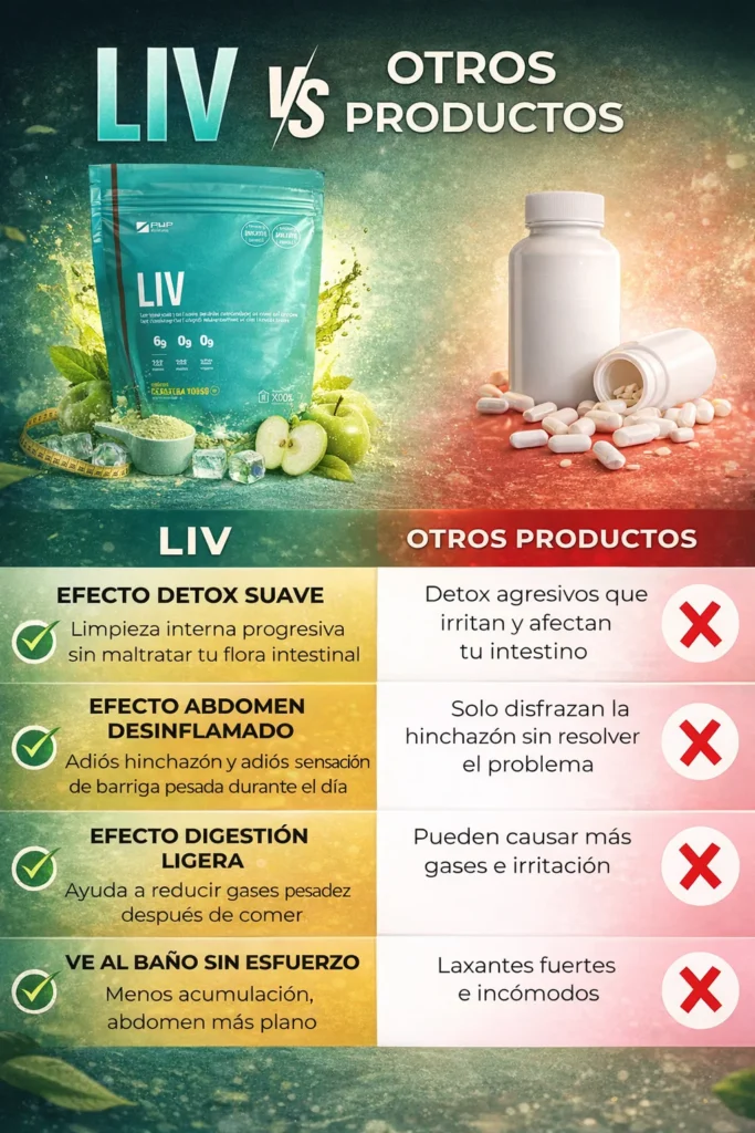 • LIV es el detox en polvo que actúa desde adentro para limpiar, desinflamar y equilibrar tu sistema digestivo rápidamente.